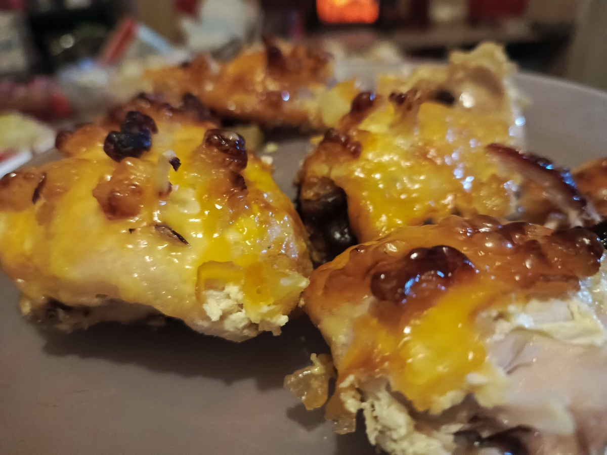 Смешиваем сметану, майонез, горчицу. Смазываем куриные бедра. Сверху выкладываем консервированный ананас и тертый сыр.