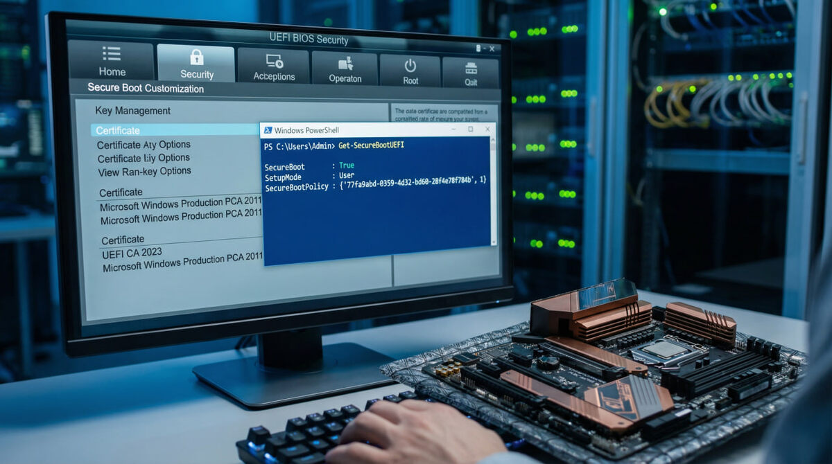 Организации могут взять контроль в свои руки. Через Intune, групповые политики или реестр администраторы управляют развертыванием. Существуют инструменты мониторинга: реестровый ключ UEFICA2023Status показывает статус - не начато, в процессе или завершено. PowerShell-команды позволяют проверить наличие новых записей в базах db и dbx. Такой подход дает гибкость, позволяя предприятиям синхронизировать обновления с собственным графиком.