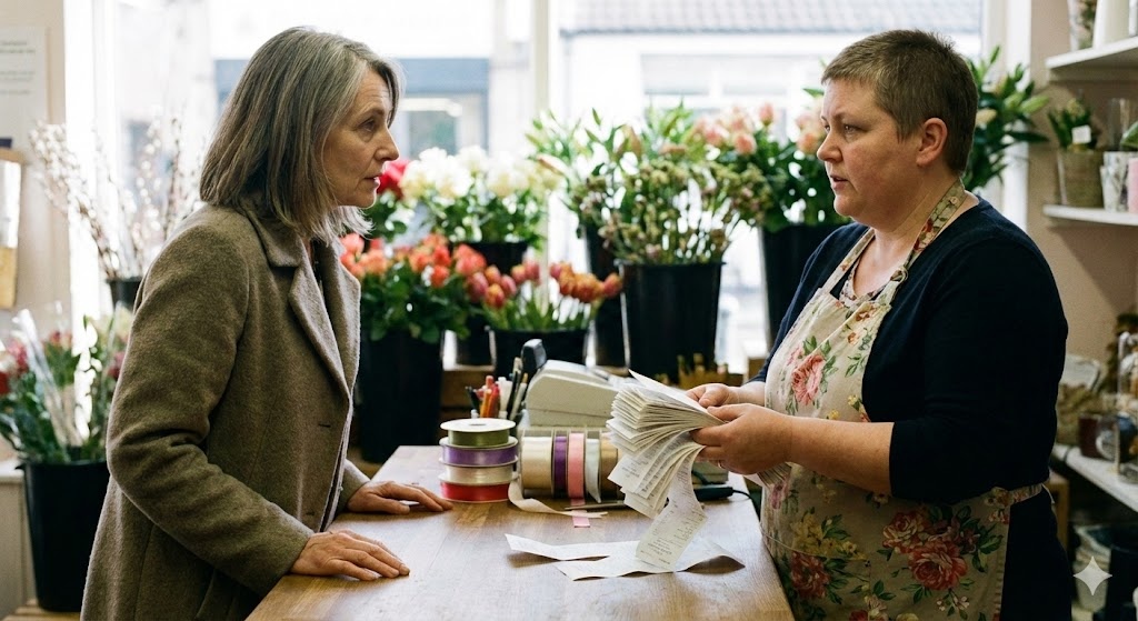 В магазине пахло свежей зеленью и влагой. Вёдра с цветами стояли вдоль стен, холодильная витрина мерцала за прилавком. Продавщица — полная женщина лет сорока в зелёном фартуке — подняла голову от букета, который перевязывала лентой.