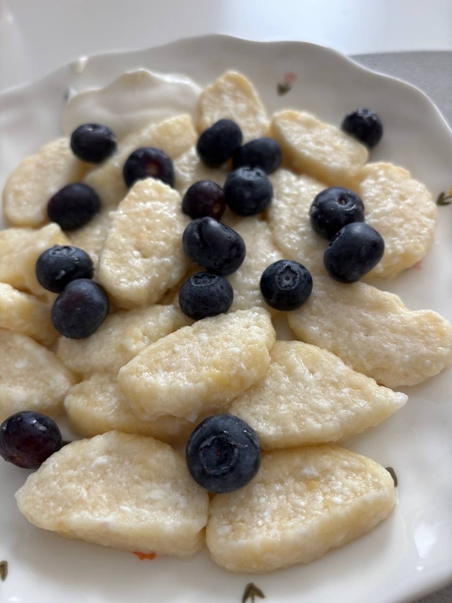 Варить в чуть подсоленной воде. В кипящую воду по одному положить вареники и очень аккуратно их помешивать, чтобы избежать склеивания. Не допускать сильного кипения воды. После того как вареники всплывут - варить 1-2 минуты. Затем выловить вареники шумовкой, добавить любимые ягоды или фрукты, сметану.