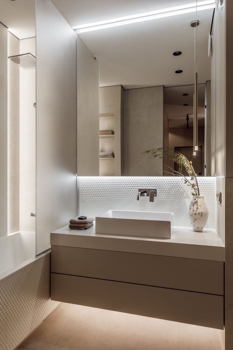 Здесь очень много тонких работ и сложных расчётов. Особенно стык ванной со стеной. Подбор правильной ванны ширины борта. Профиль, толщины, очерёдность установки. Чтобы выполнить подсветку мы долго обсуждали со строителем и искали решение .... Ииии- voilà, у нас получилось !!! 🔥🔥🔥 За внешней простотой лежит огромная работа многих людей)