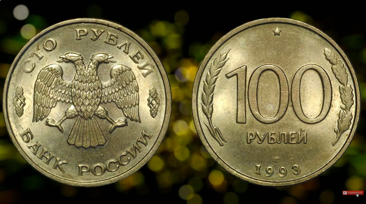 Друзья, сегодня вы узнаете о востребованности у коллекционеров монеты 100 рублей 1993 года. Дело в том, что высокие темпы инфляции в России в 1993 году отразились и на производстве монет. Если для чеканки монет номиналом 100 рублей в 1992 году использовались двухцветные кружки, то уже в 1993 году они были заменены на более простые медно-никелевые заготовки серебристого цвета. При этом изображения аверса и реверса принципиально не изменились. Если сравнивать эту монету с биметаллическими монетами 1992 года, то в 1993 году диаметр этих монет увеличился на 2 мм. Диаметр монеты в 1992 году составлял 25 мм, а рассматриваемая нами монета 1993 года уже имела диаметр 27 мм. Новые монетные сторублёвки стали не биметаллическими. Для тех, кто не знает: у биметаллических монет вставка и ободок из разных металлов. А вот наша небиметаллическая монета 100 рублей 1993 года полностью отчеканена из медно-никелевого сплава. Этот сплав называется «нейзильбер». Примечание: Нейзильбер (от нем. Neusilbe