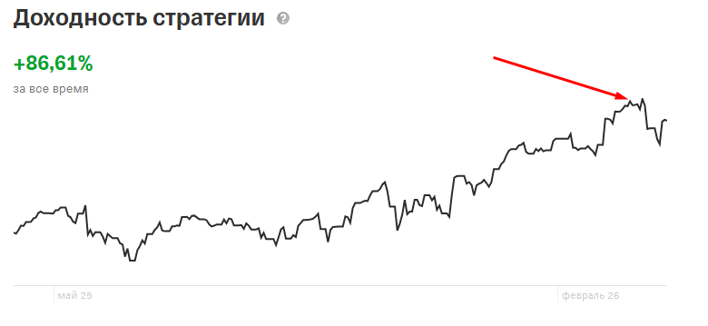 Тем, кто не следит за моей историей, рассказываю: 30 января я подключил стратегию автоследования «Фьючерсы точки роста (мини)». «Т- Инвестиции» при переходе в раздел автоследования первым делом предложили мне именно эту стратегию, плюсом я сам посмотрел на ее динамику, и меня, как, наверное, и многих других, она заинтересовала своей доходностью! На графике видно, как сильно выросла доходность автора по этой стратегии меньше чем за 1 год, было +100%, о чем даже был сделан очень горделивый пост! Все эти факторы, ну и, конечно же, моя жадность и неопытность в данном формате инвестирования вынудили меня зайти в нее на самых «хаях»!! После чего моя радость от найденного «грааля» продлилась буквально пару дней, которые выходили в плюс, после чего я получил груз нервно-эмоционального напряжения в размере 15% просадки от вклада... Если же Вы подумали, что я один такой, то, увы, нет. Параллельно со мной в стратегию вступили еще люди, которые оставляли комментарии о просадке в пульсе, которые ав