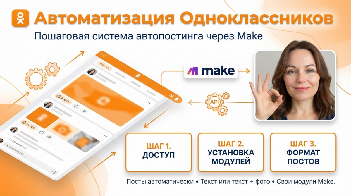 ) Вчера был день, когда я хотела разбить ноутбук 🤯, ну почти))) Более 100 попыток Сотни ошибок API Желание все бросить возрастало с каждой минутой С чего все началось 👇 В личку приходят запросы на Одноклассники, но готовых модулей у меня не было Технически ОК - это тот еще квест Жесткое форматирование текста, создание приложения и получения 4х ключей, чтобы подключить автоматизацию А если нейросеть поставит лишний пробел или звездочку *, автоматизация не пройдет Операции в Make и деньги на нейросеть потрачены зря Я могла бы потратить еще неделю, пытаясь упаковать все в 2 идеальных красивых модуля, ну или вообще сдаться, не получается же🤦♀️ Но у меня есть принцип: Лучше работающая система на троечку СЕЙЧАС, чем идеальная система НИКОГДА Поэтому я решила, что пусть будет 5 модулей вместо 2, да схема выглядит чуть сложнее, чем хотелось бы, зато они работают прямо сейчас 🎁 ЧТО Я ДЛЯ ВАС ПРИГОТОВИЛА: Отдаю вам готовые инструменты, чтобы вы могли настроить постинг в ОК с