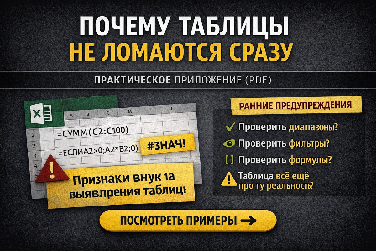 Почему таблицы редко ломаются сразу. Самая опасная ошибка в Excel появляется не в момент сбоя. Она растёт тихо — и именно поэтому её не замечают. Самые дорогие ошибки в таблицах не выглядят как ошибка. Там нет #ДЕЛ/0!, нет #ЗНАЧ!, нет красных ячеек и предупреждений. Файл открывается, формулы считают, итоговая цифра аккуратно стоит внизу справа. Визуально — порядок. Именно в этот момент возникает иллюзия устойчивости. Если Excel не ругается, значит всё под контролем. Если формула возвращает число — значит она корректна. Но Excel не проверяет смысл задачи. Он проверяет только синтаксис. И вот тут начинается самое интересное: таблицы почти никогда не «падают» сразу. Они медленно перестают соответствовать реальности. Представьте отчёт по продажам. В нём есть формула: =СУММ(C2:C100) Диапазон корректный, логика верная, всё считает. Через месяц появляется 101-я строка. Потом 120-я. Потом 200-я. Формула продолжает работать идеально — но новые данные уже не учитывает. Excel не обязан знать, чт