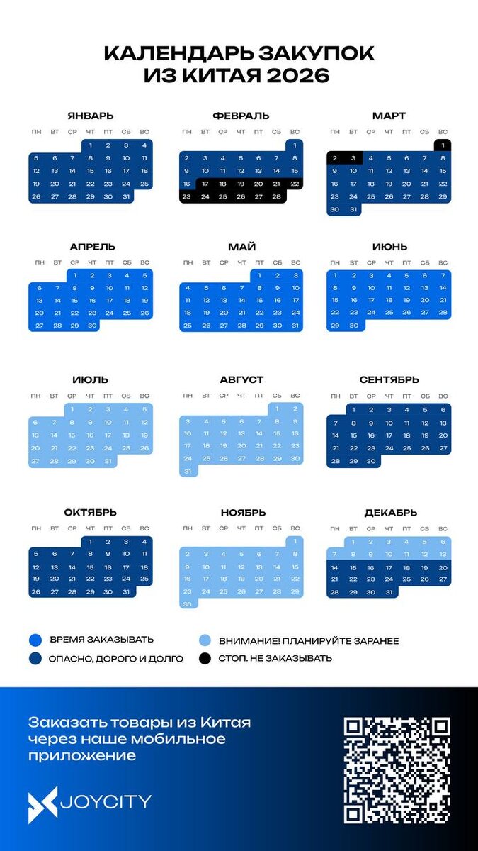 Мы знаем, что 80% проблем с поставками заключается в неправильном планировании. Чтобы Вы всегда были с товарами в сезон, а ваш капитал не «засыпал» на складе, мы создали наглядный гид по лучшим и худшим периодам для заказа Почему с JOYCITY вы проходите этот календарь без потерь? Логистика JOYCITY берет на себя роль эксперта, помогая избежать главных рисков оформления и доставки вашего товара на территорию РФ. С нами Вы знаете, где Ваш груз и на каком он этапе, даже когда вокруг хаос сезона. JOYCITY — партнер для тех, кто строит бизнес на долгосрочную перспективу сохраняйте себе этот бесплатный календарь JOYCITY, ведь он убережет вас от дорогих ошибок в 2026 году! Рассказываем, как и когда не потерять деньги на логистике из Китая 🟠январь (2-я половина): Китайский новый год начинается с 17 февраля. Но уже с конца января фабрики начинают замедлять работу, сотрудники уезжают. Заказывать можно, но только с учетом, что производство начнется ТОЛЬКО после праздников 🟠февраль (1-я половина):