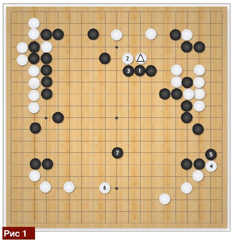 На рисунке 1 партия японских проф. игроков. За черных Норимото, выдержки из книги которого я разбирал ранее. Последний ход белых отмечен треугольником. У черных есть простой сценарий (рис. 1) – атака в лоб слабой белой группы в расчете закрыть весь центр. Но по мнению автора книги, такой сценарий возможен. Норимото предпочел пойти по более длинному пути к выигрышу. Он не стал «подписывать» себя на центр и начал прощупывать белых на нижней стороне. На рис. 2 показано начало длинной стратегии пробных камней. Сначала черные нажимают на угол справа. Давлением черные проясняют позицию внизу: белые точно будут защищать тут территорию. После чего переключаются на атаку нижнего левого угла. Норимото оставляет два возможных сценария развития событий. Если белые отдадут много территории на нижней стороне, тогда он выживет и вытеснит белых в центр, где только влияние черных. Белые там ничего не заработают. Если белые выберут конфликт, то черные «продадут» белым несколько камней, выигрывая в