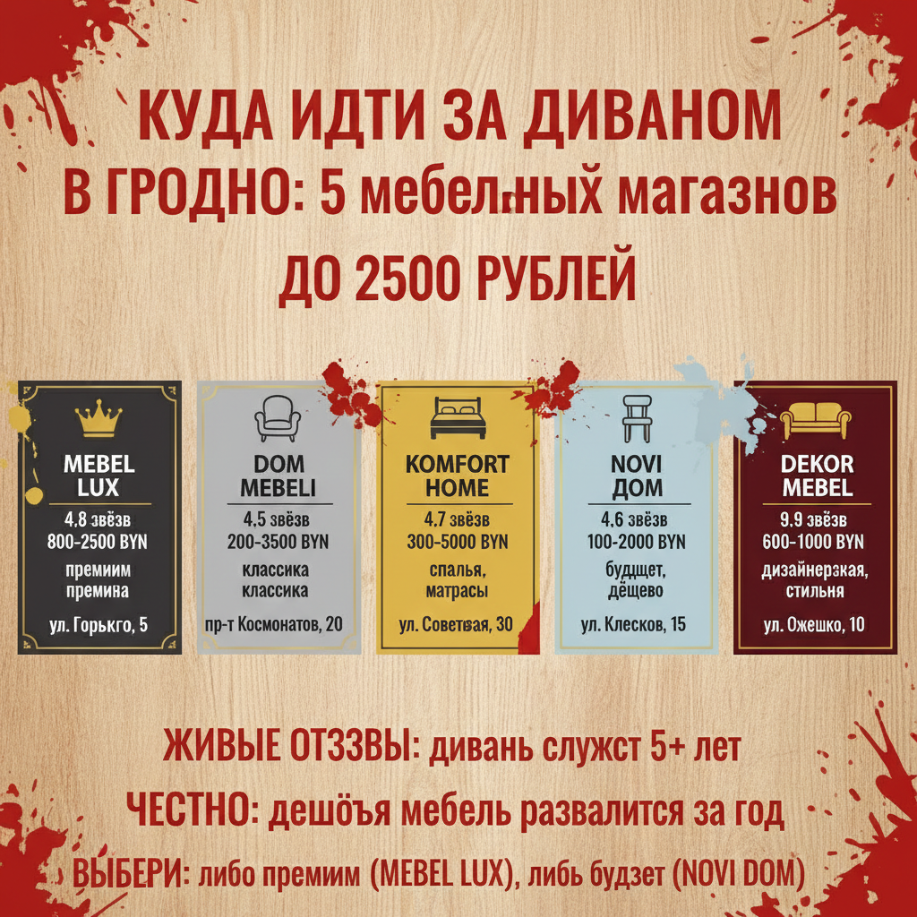 Сидишь в квартире на старом диване, пружины прыгают, обивка висит — и понимаешь: пора. Идёшь в гугл, вводишь "мебель Гродно" — и голова идёт кругом. В городе больше 15 магазинов, все кричат "скидки!", "доставка бесплатная!", "лучшее качество!". Кому верить? Давай разберёмся, где реально купить нормальный диван и не выбросить деньги в окно.