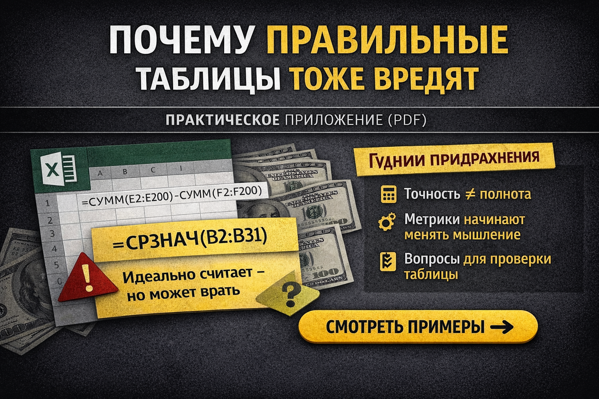 Формулы корректны, диапазоны точные, ошибок нет — но решения становятся хуже. Разбираем, как «правильные» таблицы начинают искажать реальность. Есть тип таблиц, к которым сложно придраться. В них нет #ДЕЛ/0!, нет #ЗНАЧ!, формулы логичны, структура аккуратная, цвета спокойные. Такие файлы часто называют «хорошо собранными». Именно поэтому по ним принимают решения. Проблема в том, что корректность формул и корректность выводов — это не одно и то же. Excel может считать безупречно. Но если сама постановка задачи устарела или слишком узкая, результат будет аккуратным — и при этом вредным. Представьте отчёт по марже. Формула: =СУММ(E2:E200)-СУММ(F2:F200) Всё честно: выручка минус затраты. Итог стабилен, динамика понятна. Но за последний год в бизнесе появились новые косвенные расходы, которые в таблицу не включили. Формула не изменилась. Она остаётся правильной. Но показатель уже не отражает реальность. И чем аккуратнее выглядит отчёт, тем меньше вероятность, что кто-то задаст вопрос: «А м
