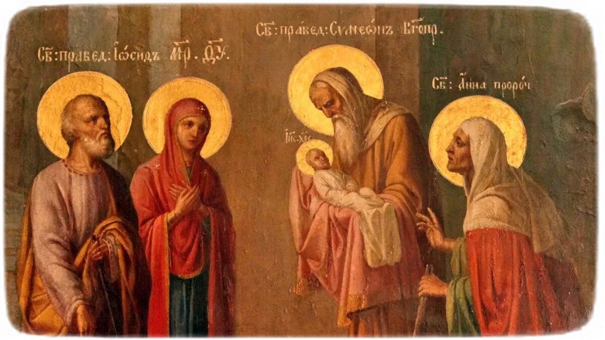 Сретение Господне - один главных двенадцати (двунадесятых) праздников, отмечаемый Русской Православной Церковью 15 февраля. Название праздника "Сретение" обозначает "встречу" в переводе с церковно-славянского ("сърѣтение"). После Рождества на сороковой день Мария и Иосиф принесли младенца Иисуса в храм в Иерусалиме, чтобы посвятить Богу. Согласно закону Моисея Господу посвящались все первенцы - мальчики в память об избавлении еврейских первенцев от гибели, в то время как ангелом были поражены египетские первенцы. В храме младенец Христос был встречен праведным 300-летним старцем Симеоном, которого привёл в то самое время Дух Божий. Праведный Симеон переводил Священное писание с еврейского на греческий. Интерпретируя фразу: "Се Дева во чреве приимет и родит Сына" усомнился, что дева может родить. Вместо слова "Дева" хотел написать слово "Жена" (женщина). Ангел остановил его руку и сказал, что Симеон не умрёт пока лично не увидит рождённого от Девы сына. Симеон взял на руки младенца, ро