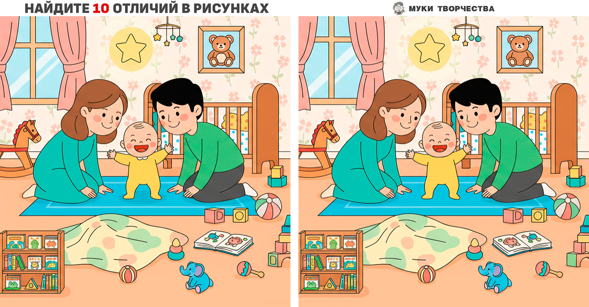 Что может быть милее, чем первые шаги малыша? Ну, разве что первые произнесённые слова «мама» и «папа». Сегодня перед вами два похожих рисунка с молодой семьёй. Но в одном изображении художник специально сделал десять небольших отличий. Проверьте себя на внимательность к деталям, найдите все отличия. Они могут скрываться в добавленных или стёртых предметах, в их цвете и форме. На всякий случай подсказка-ответ будет в конце этой статьи. Но я верю, что она вам пригодится лишь для того, чтобы сверить свои предположения. Удачи вам! Горизонтальный вариант теста: Молодая семья Вертикальный вариант теста: Молодая семья АА-а ТУт ЕЩё БОльше ЗАдачек НА ВНимание: НИЖЕ БУДЕТ ОТВЕТ: