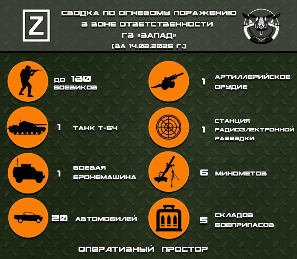 Сводка по огневому поражению в зоне ответственности ГВ «Запад» за 14.02.2026 г