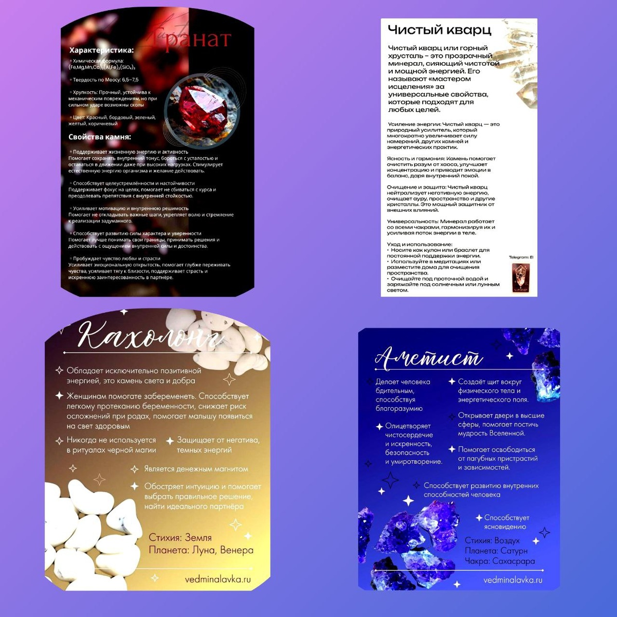 . Мои фавориты : Кахолонг Аметист Кварц прозрачный Гранат 1. Аметист-камень излучающий ультрафиолет овые излучения . Он любит темноту и холод . Вода самый лучший вариант очистки этого камня , а вот солнце и нагревы он боится и теряет свою окраску и свойства . Может так же в соленой воде покупать его , но не долго . 2. Кахолонг -это кальцит , пористый камушек с очень вощными свойствами защиты , высокочастотный . Он не любит купаться в воде и при долгом контакте , распадается . Ему хорошо в соли , на не продолжительном контакте со свечей , солнцем . 3.Гранат -энергия Земли , излучение в диапазоне инфракрасного излучения . Любит все воду , огонь , соль , лунный свет . 4. Кварц - один из самых лучший управителей энергией . Кварцевые кюветы используют в лабораториях . Он увеличивает электрический потенциал , делает спектры света более натянутыми как струны и яркими , а значит высокочастотными . В очистке от негатива он универсален . Вода , соль , огонь , лунный свет , солнце . #ОмоёмД