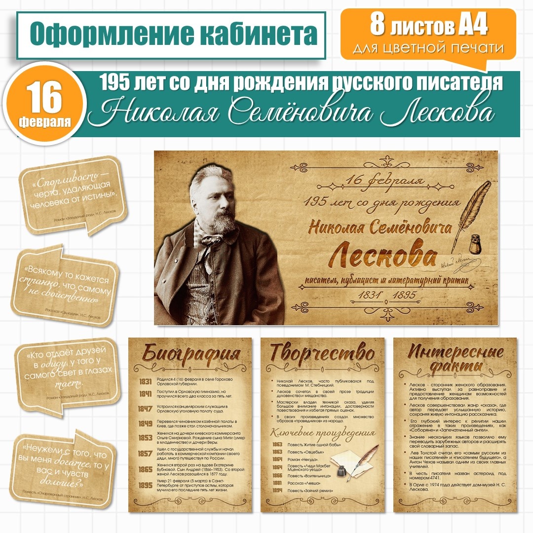 Оформление стенда "195 лет со дня рождения русского писателя Н. С. Лескова (1831–1895)". Комплект материалов предназначен для оформления выставочных стендов в библиотеках, школах (классах литературы) и других образовательных учреждениях к 195-летию со дня рождения русского писателя Николая Семёновича Лескова (1831–1895). Комплект материалов: Материалы сочетают в себе декоративную функцию (создание праздничной атмосферы) и информационную (представление сведений о жизни и творчестве писателя). Скачать материал по подписке Инфоурок: Оформление Лесков Жду Вас в своем сообществе в ВК: Есть идеЯ!