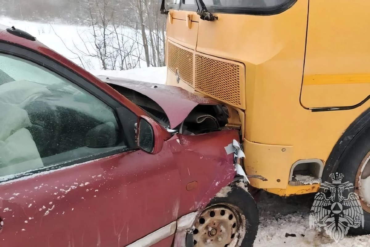 В Ивановской области лоб в лоб столкнулись легковушка и школьный автобус