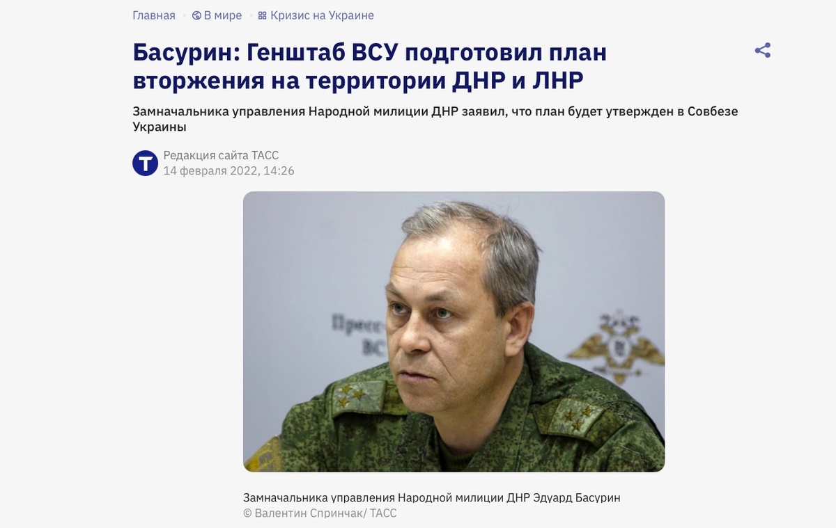 - Генштаб ВСУ подготовил план вторжения на территорию ДНР и ЛНР. Об этом в понедельник, 14 февраля, заявил заместитель начальника управления Народной милиции ДНР Эдуард Басурин. «Генштаб ВС Украины уже подготовил план о вторжении на территории республик, он скоро будет утверждён на Совете национальной безопасности и обороны Украины (СНБО)», — заявил Басурин в эфире телеканала «Россия 1».