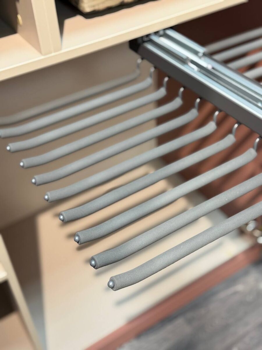 Знакомьтесь с одним из самых удобных решений для организации гардеробной — специальными выдвижными штангами (рилингами) для брюк. Это не просто система хранения, а настоящая находка для тех, кто ценит порядок, бережное отношение к вещам и мгновенный доступ к своему гардеробу. Почему это так удобно? 1. Экономия пространства — Вертикальное хранение освобождает полки и штанги — Можно разместить в узких секциях или угловых зонах 2. Сохранение формы одежды — Брюки висят без заломов и складок — Идеально для костюмных, классических и деликатных тканей 3. Быстрый доступ и обзор — Легко выдвинуть и выбрать нужную пару — Весь ассортимент перед глазами — никакого поиска в стопках 4. Универсальность — Подходит также для юбок, шарфов, ремней и галстуков — Может комбинироваться с другими системами хранения Технические особенности: - Плавный выдвижной механизм с доводчиком - Надёжная металлическая конструкция - Регулируемая высота расположения - Компактность и простота монтажа Идеально для: -