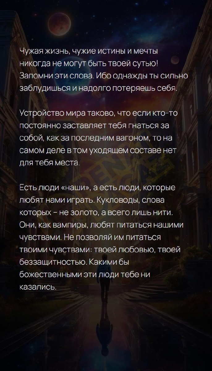 Чужая жизнь, чужие истины и мечты никогда не могут быть твоей сутью! Запомни эти слова. Ибо однажды ты сильно заблудишься и надолго потеряешь себя. Устройство мира таково, что если кто-то постоянно заставляет тебя гнаться за собой, как за последним вагоном, то на самом деле в том уходящем составе нет для тебя места. Есть люди «наши», а есть люди, которые любят нами играть. Кукловоды, слова которых – не золото, а всего лишь нити. Они, как вампиры, любят питаться нашими чувствами. Не позволяй им питаться твоими чувствами: твоей любовью, твоей беззащитностью. Какими бы божественными эти люди тебе ни казались. Архитектура вашей души | Архитектура вашей души T | VK | Pin | YouTub | Dzen #истина #вселеннаяслышит #начало #квантовыйскачок #подсознаниеможетвсе #момент #путьксебе #энергиядня #блог #14число #14февраля