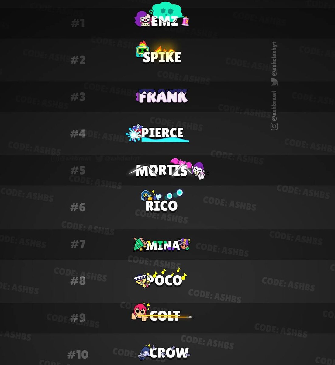 AshBS опубликовал список сильнейших персонажей на текущий момент. Первое место всё ещё удерживает Эмз, следом идут Спайк и Фрэнк, а Мортис расположился только на пятой позиции. ✅Новости по Clash Royale - ТЫК 💬Новости по Roblox - ТЫК Мир Supercell. Подписаться