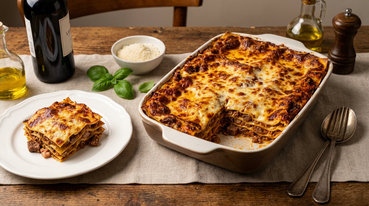 Форма 20×30 см, 6–8 порций. Лучше всего — приготовить ragù накануне. Опция “ресторанный коллаген”: желатин 8–10 г (если бульон не на костях). Цель: соус “липкий”, насыщенный, держит слои. Духовка 190°C (верх/низ). Важно: моцареллу клади умеренно, лучше ближе к верху (даёт влагу). Бешамель щедро + пармезан + немного моцареллы.