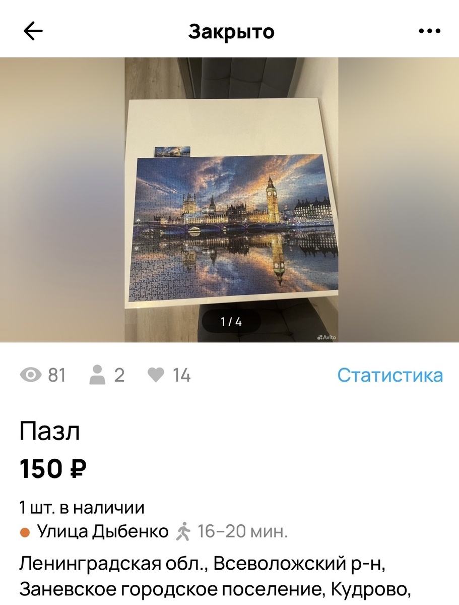 За пол месяца у меня была только одна продажа и та самовывозом. Забрали пазл за 150 рублей. На него был очень высокий спрос, несколько раз писали и хотели забрать в течение часа. Вот наконец-то всё сложилось, именно в этот день у меня был выходной, договорились с девушкой, она пришла ко времени и забрала этот пазл.