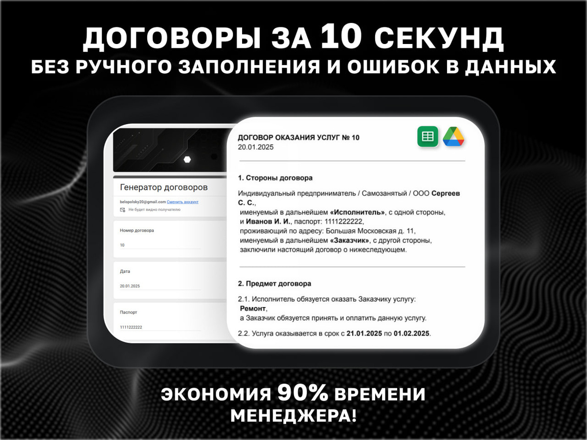 Я аналитик данных, работаю с Google Таблицами каждый день, автоматизирую отчетность для крупных компаний. И в какой-то момент меня осенило: почему я считаю в таблицах сложные бюджеты на миллионы, а свои собственные договоры заполняю руками, как в каменном веке?