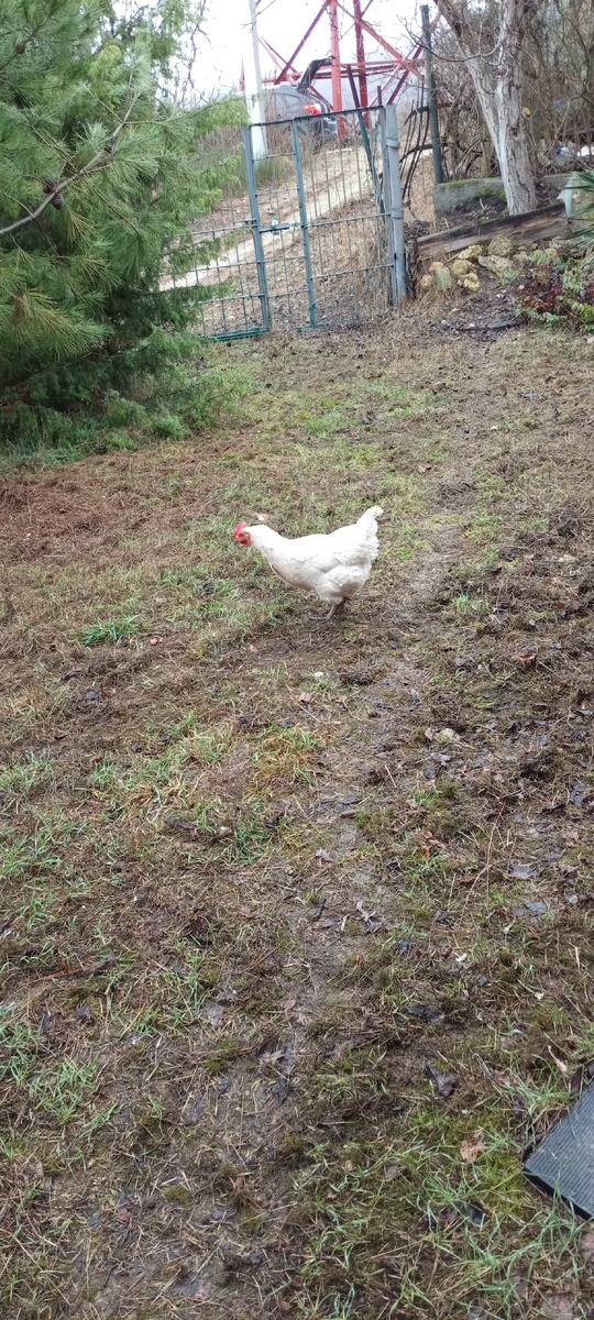 Поехали на дачу сетку отвезти, а там сосед новый. Пристроил домик на склоне крошечный и три курицы у него. Точнее, один петух тощий и две курицы. Одна толстая, на нее автор и позарилась, вторая- худая.