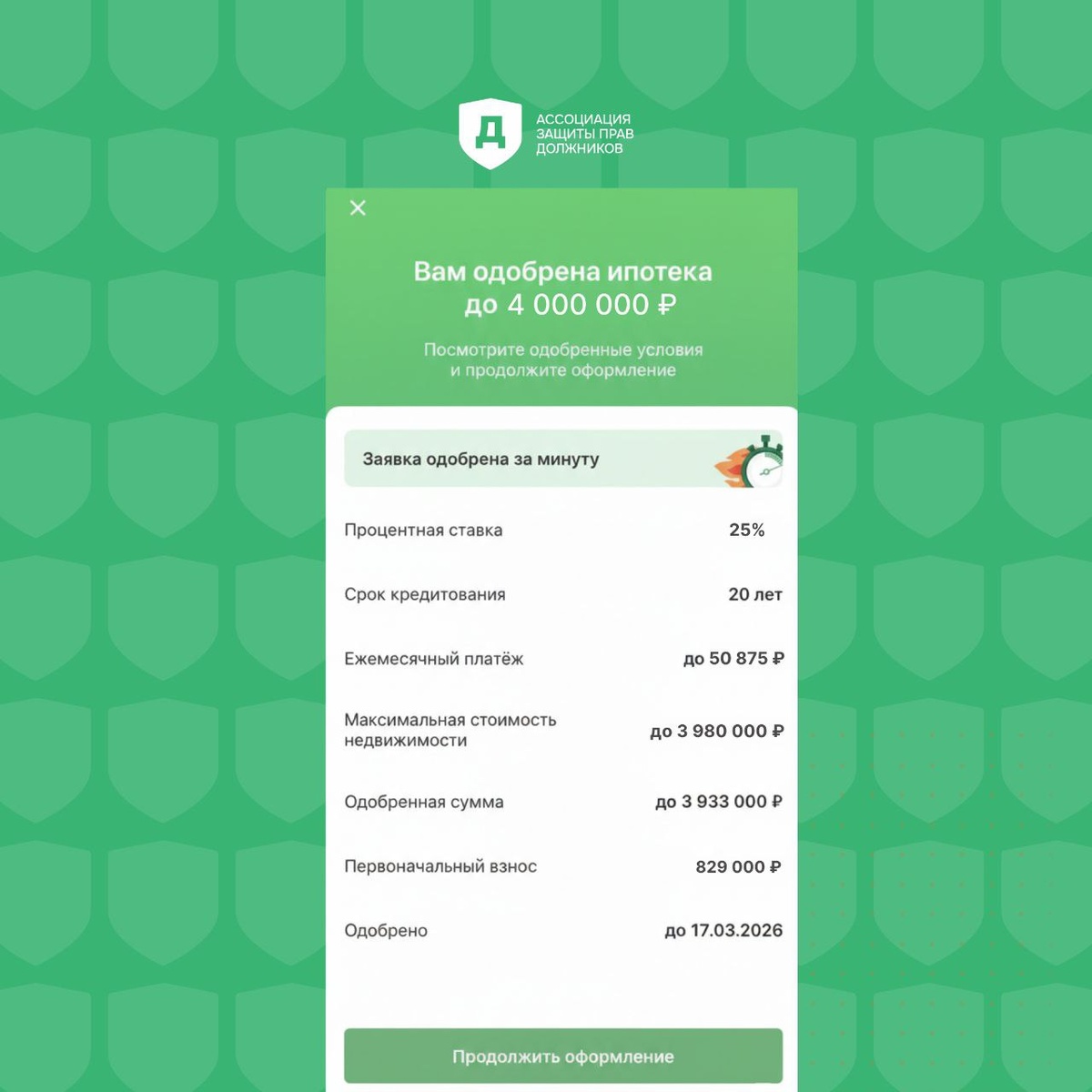 Наш клиент списал в АЗПД долг в 2,7 млн рублей и спустя год подал заявку на покупку жилья. Результат на скриншоте 👆 — одобрена сумма 4 000 000 ₽. Да, ставка 25% — это суровая реальность рынка 2026 года, но сам факт одобрения спустя год после банкротства доказывает: бояться вам нечего. После банкротства в глазах представителей банка вы чисты. Им выгоднее выдать кредит человеку без долгов, чем тому, кто годами тонет в просрочках. 📍Выдержать паузу в 6–8 месяцев без новых заявок. 📍Активно пользоваться дебетовой картой (показывать банку обороты). 📍Взять небольшую рассрочку и закрыть её вовремя. Если сейчас у вас последние деньги уходят на проценты банку, то вы уже в долговой яме. Списание долгов через банкротство — это ваш единственный законный способ снова стать платежеспособным и