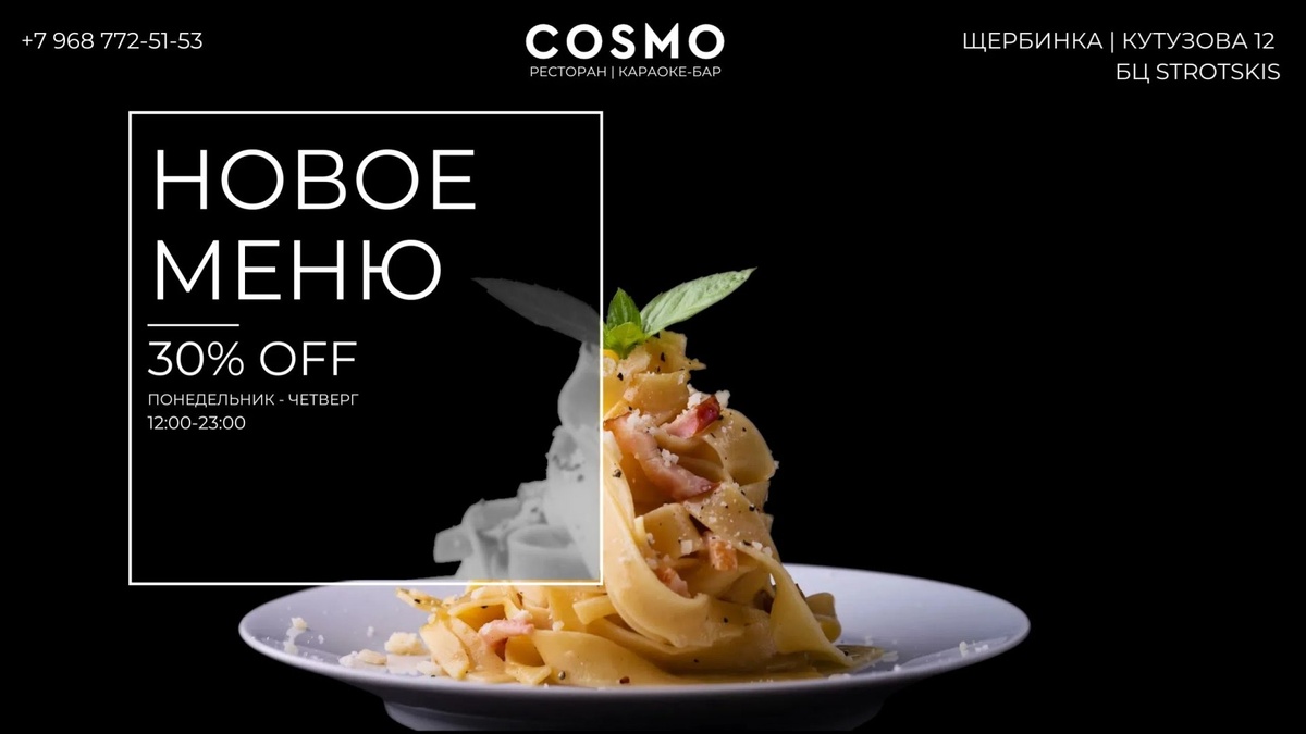 🥘 Мы рады представить обновлённое меню! Пересмотрели рецептуры, добавили новые позиции - теперь ещё больше ярких сочетаний и текстур. drive.google.com/file/d/1EU... 📶 Категория: Ресторан 🏢 Место: Ресторан-караоке "Cosmo" 📍Адрес: г. Подольск, Щербинка, ул. Кутузова, 12 БЦ Strotskis, этаж 5 ⏱ Часы работы: Пн-Чт: 12:00 – 23:00 Пт-Сб: 12:00 – 05:00 Вс - выходной. ✅ Где поесть, Подольск!? https://dzen.ru/id/6756016c107ef731969e16a5 https://vk.com/gde_poest_podolsk https://dzen.ru/gde_poest_v_podolske