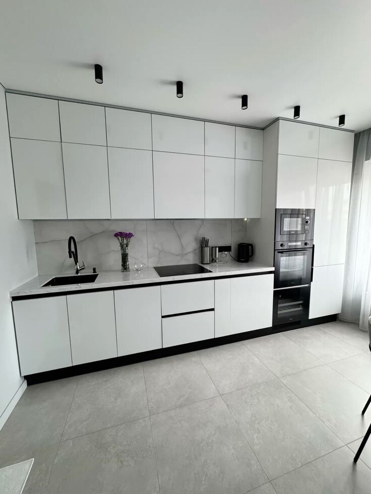 - Белый + Черный/Графит. Смелое и графичное решение. Используйте черный для акцентов: фартук, столешница, техника, светильники, ножки стульев. Это придает интерьеру динамику и современное звучание. Контраст черного и белого создает четкую структуру и визуальный порядок.