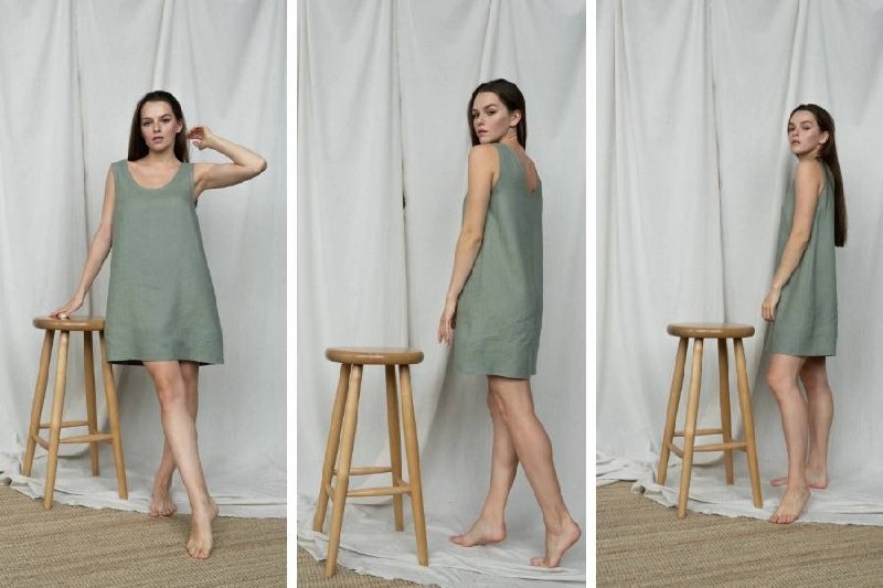 Легкое и женственное платье-сорочка из умягченного льна. Круглый вырез горловины спереди и широкие бретели, модель выполнена в нежном оттенке "Олива".