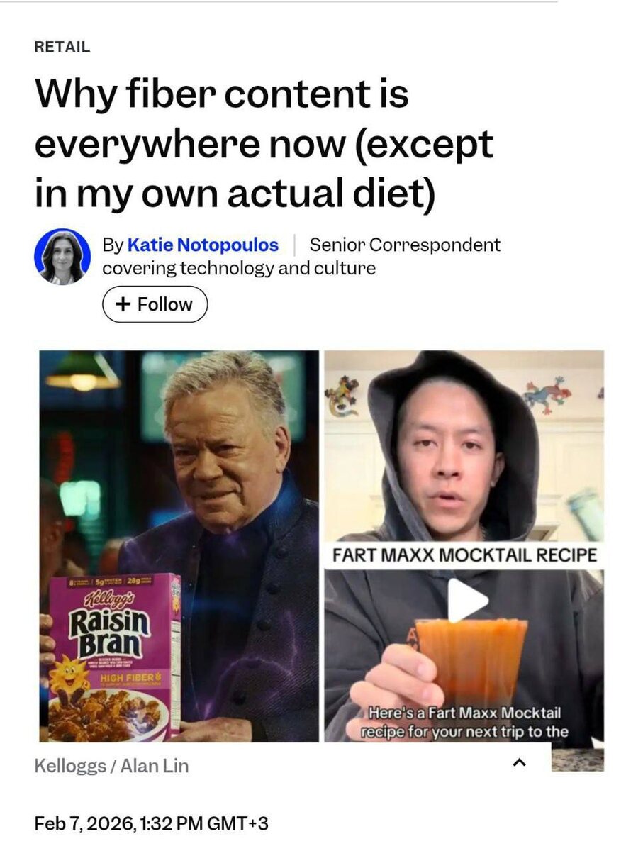 Пока рынок несколько лет «качал» протеин, в 2026-м производители делают ставку на клетчатку. И это уже не нишевая история, а глобальный тренд. Среди тех, кто активно тестирует или запускает продукты с добавленной клетчаткой: • Starbucks — запускает fiber-версии напитков • PepsiCo — добавляет клетчатку в снеки • Coca-Cola — тестирует газировку с клетчаткой • McDonald's — называет её главным трендом 2026 года Даже на Super Bowl в рекламе открыто шутили про клетчатку и работу кишечника — тема вышла в мейнстрим. 📊 Почему именно сейчас? 1️⃣ Протеиновый бум перегрел рынок Многие «протеиновые» продукты оказались маркетингом с минимальной реальной пользой для большинства людей. Потребность в белке у среднестатистического человека закрывается обычным рационом. 2️⃣ Дефицит клетчатки — реальная проблема Современное питание (фастфуд, рафинированные продукты, сладкие напитки) почти вытеснило овощи, бобовые и цельные злаки. По данным международных исследований, большинство людей потребляют в