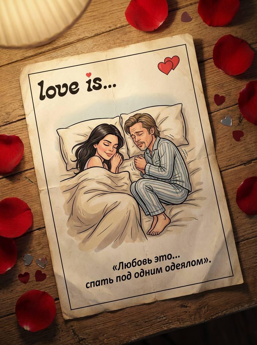 Модель: Nano Banana Сгенерировать🪄 Использовать предоставленные референсные изображения. Черты лиц, внешность, причёски строго сохранены. Ultra-realistic photo, предметная съёмка. Винтажный вкладыш «Love is…» лежит на деревянном столе. Состаренная бумага с заломами и лёгкими потертостями, тонкая чёрная рамка по краю. В верхней части надпись «Love is…» в фирменном стиле и маленькое красное сердечко. Иллюстрация строго в стиле classic Love Is cartoon realism: ручная комиксная отрисовка, чёткий контур, мягкие тени, мульт-реализм, эстетика оригинальных вкладышей 90-х. В центре — та же пара из референсов Действие внутри иллюстрации: женщина сладко спит под одеялом, на лице лёгкая улыбка, ощущение уюта и тепла. мужчина спит рядом без одеяла, в пижаме, слегка съёжившийся Контраст действий подчёркивает юмор и близость сцены. Внизу текст: «Любовь это… спать под одним одеялом» Окружение кадра: вкладыш лежит на столе, вокруг элементы Дня святого Валентина: маленькие сердечки, лепестки роз. Мягк