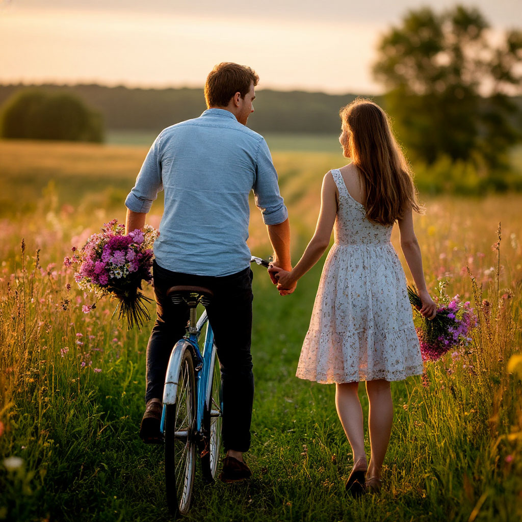 Описание: сделано в Шедевруме. Создать картинку - Мужчина едет на велосипеде , утро, кругом глухое поле, красота, лето, нарвал цветов, сказал ей она забыла об их встречах, на память подарил любимой девушке букет, она взяла букет, но не рада, но мужчина все же девушку любит.