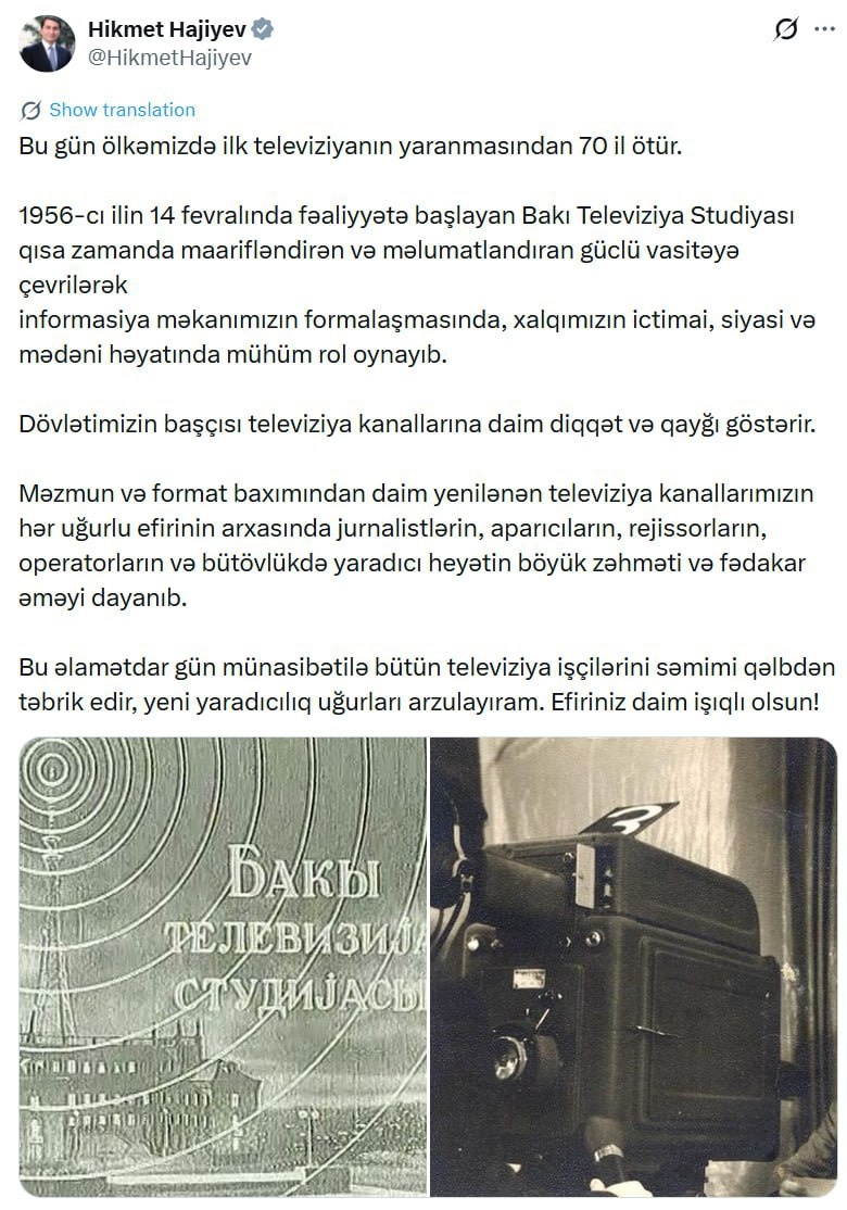 🇦🇿 Сегодня исполняется 70 лет со дня создания первого телевидения в нашей стране