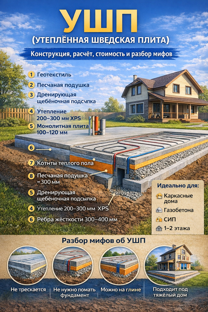УШП — это монолитный плитный фундамент мелкого заложения с интегрированным утеплением и системой водяного тёплого пола. Технология пришла из Скандинавии и ориентирована на энергоэффективность, стабильность на пучинистых грунтах и сокращение сроков строительства. Важно понимать: УШП — это инженерная система, объединяющая фундамент, черновой пол, утепление и отопление в одном конструктиве. Конструкция УШП: из чего состоит «пирог» Типовая структура: 1. Геотекстиль (разделительный слой). 2. Песчаная подушка с послойным уплотнением. 3. Щебёночная дренирующая подготовка. 4. Экструдированный пенополистирол 200–300 мм. 5. Монолитная железобетонная плита 100–120 мм. 6. Рёбра жёсткости 300–400 мм под несущими стенами. 7. Двухслойное армирование Ø8–12 мм. 8. Контуры водяного тёплого пола. 9. Закладные коммуникации (вода, канализация, электрика). Ключевой принцип — формирование замкнутого теплового контура под всем домом, включая периметр. Обязательна ли геология? Да. Без инженерно-геологических