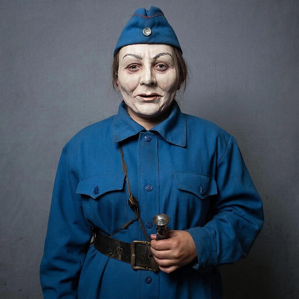 · Женщина средних лет или чуть старше. Форма — синяя или бордовая, старого образца (ещё с эмблемой МПС или самых первых лет РЖД), аккуратная, но сильно выцветшая и потёртая.