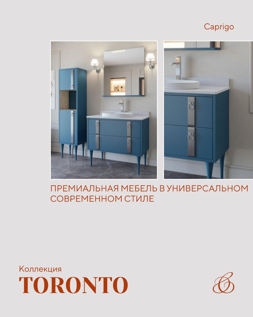 Без лишнего шума, но с характером. Чёткие линии, аккуратные фасады и та самая фурнитура, которая делает интерьер «собранным». 🔘 Toronto легко складывается в готовое решение для ванной: удобные тумбы, стройный пенал, зеркала с полочкой. Всё логично и на своих местах. ✅ Раковины встраиваются в столешницу из искусственного камня Caprigo-White или кварца Silestone 20 мм. Производство своё, поэтому за качество спокойны. ✅ Материалы рассчитаны на жизнь, а не на картинки: влагостойкий МДФ, массив бука, итальянская антивлагоподготовка. Цвет можно выбрать любой из палитры Classic, а декор в золоте или стали. ✅ Фурнитура европейская, с доводчиками. Ящики закрываются тихо, и утро начинается чуть приятнее. Коллекция на сайте ❤️ CAPRIGO