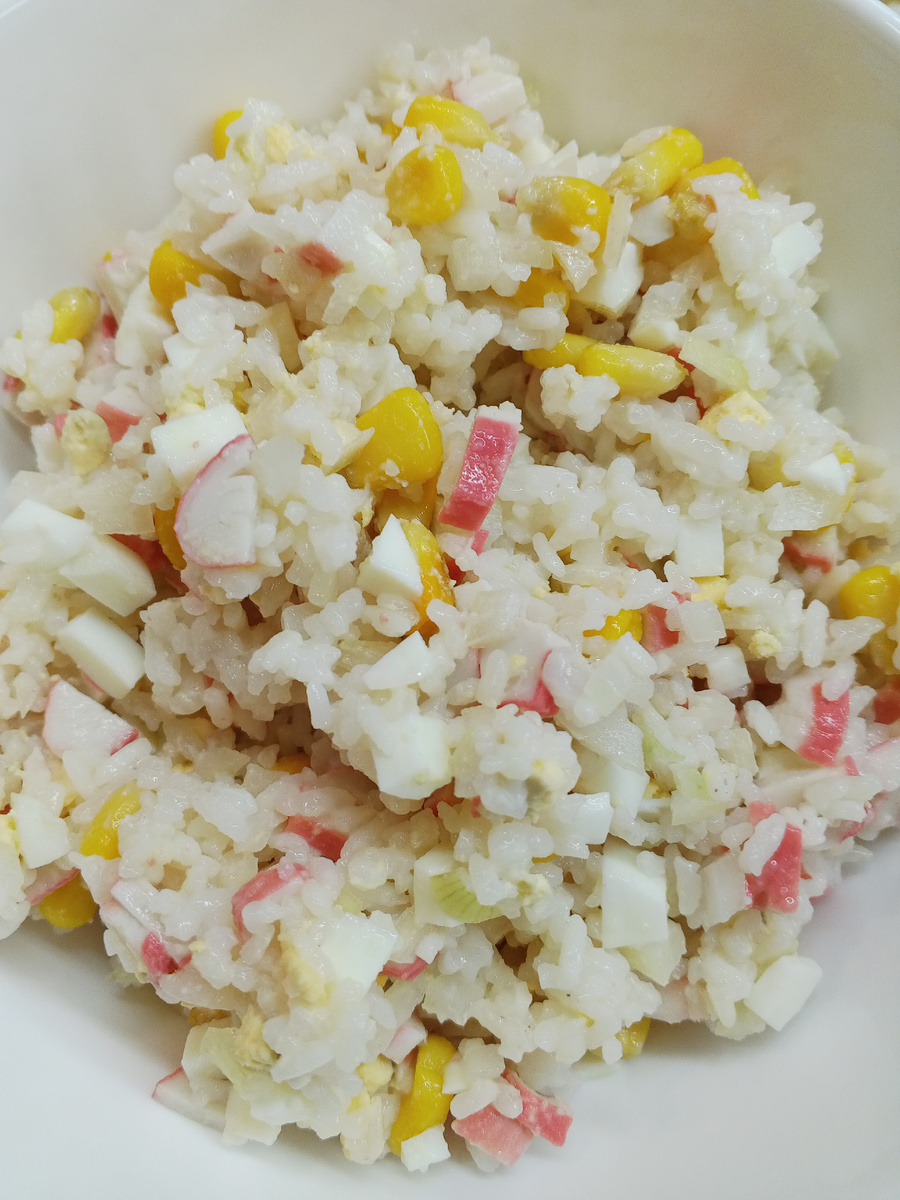 Вареный рис, яйца, крабовые палочки или крабовое мясо и консервированная кукуруза. Все хорошо перемешиваем.