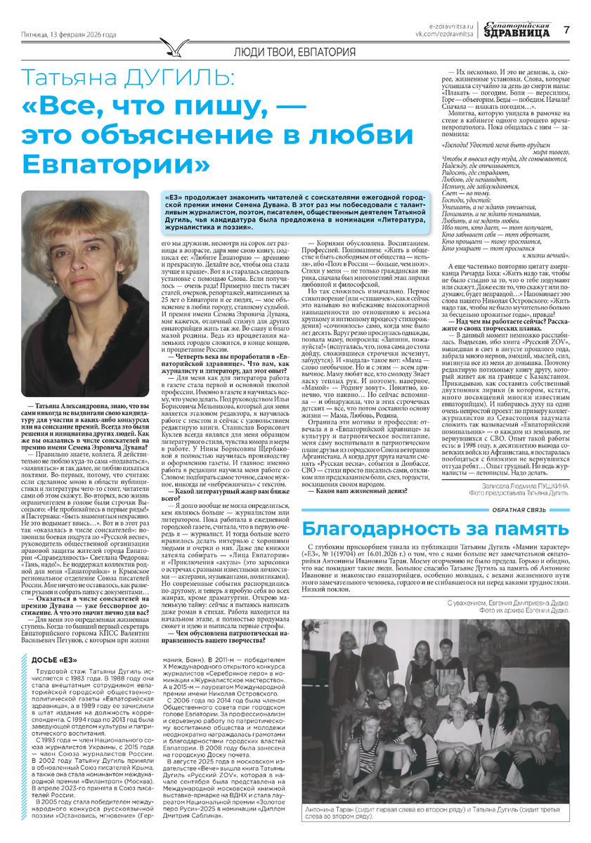 – Для меня это определенная жизненная ступень. Когда-то бывший первый секретарь Евпаторийского горкома КПСС Валентин Васильевич Петунов, с которым при жизни его мы дружили, несмотря на сорок лет разницы в возрасте, даря мне свою книгу, подписал ее: «Любите Евпаторию – древнюю и прекрасную. Делайте все, чтобы она стала лучше и краше». Вот я и старалась следовать установке с помощью Слова. Если получилось – очень рада! Примерно шесть тысяч статей, очерков, репортажей, написанных за 25 лет о Евпатории и ее людях, – мое объяснение в любви городу, ставшему судьбой. И премия имени Семена Эзровича Дувана, мне кажется, отличный стимул для других евпаторийцев жить так же. Во славу и благо малой родины. Ведь из процветания маленьких городов сложится, в конце концов, и процветание России.