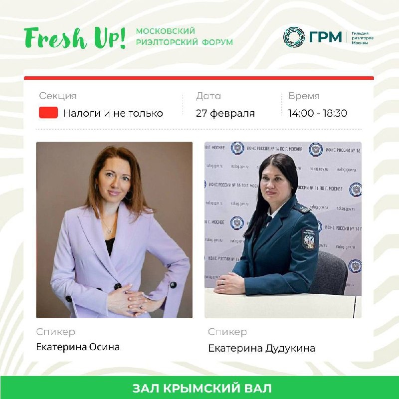 » Продолжаем знакомство 📆 27 февраля 🕘 14:00–18:30 📍 зал Крымский Вал 🗣 Спикеры: Екатерина Осина - налоговый консультант по сделкам с недвижимостью 📌 Тема: «Налоговый чек-ап. Ключевые изменения в НК РФ при продаже недвижимости». Екатерина Дудукина – Начальник отдела камеральных проверок Nº6. ИФНС России Nº16 по г Москве 📌 Тема: «Риэлторская деятельность. Юридическая и налоговая ответственность». Что вы получите посетив секцию «Налоги»: ➖ Практические рекомендации по налоговым вопросам в недвижимости ➖ Как оптимизировать налоги и минимизировать риски ➖ Разбор типичных ошибок и кейсов из реальной практики ➖ Пошаговый план легальной работы специалиста рынка недвижимости ➖ Понимание налоговых последствий оформления наследства и дарения ➖ Обновленную прошивку в части налогов при продаже недвижимости до актуальной версии 2026. 🔗 Регистрация на форум на форум и подробности — на сайте Fresh Up 2026