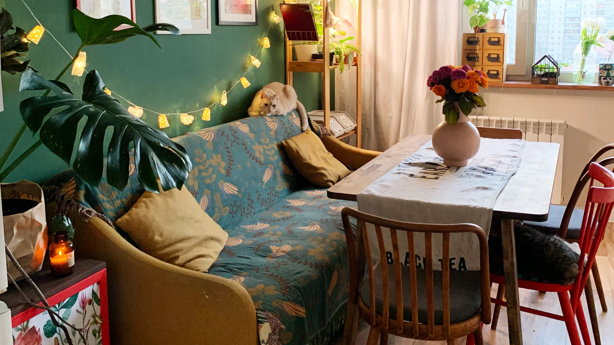 У нас получилась действительно очень уютная квартира: в ней много света, цвета, зелени и жизни. Каждый раз, когда я захожу в какую-то из комнат, мне есть что рассмотреть — будь то яркая стена, отдельный предмет интерьера или просто постер в рамочке. Абсолютно всё делалось с душой и для себя, поэтому оно так откликается.