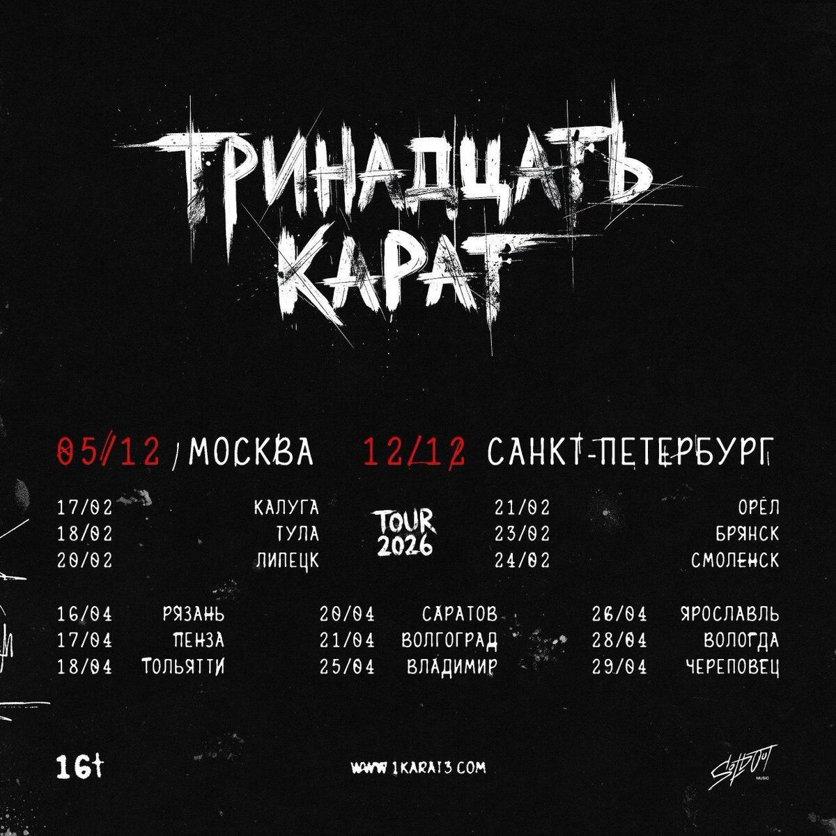 🎤 – тринадцать карат 📍 – 19 городов: Калуга, Тула, Липецк, Орёл, Брянск, Смоленск, Рязань, Пенза, Тольятти, Саратов, Волгоград, Владимир, Ярославль, Вологда, Череповец, Москва, Санкт-Петербург, Великий Новгород, Петрозаводск 🗓 – основная часть: 17 февраля 2026 – 23 мая 2026, Москва – 5 декабря 2026, Санкт-Петербург – 12 декабря 2026 💵 – от 1 200 руб. 🔗 – билеты (16+) #концерты #билетынаконцерт #тринадцатькарат #калуга #тула #липецк #орел #брянск #смоленск #рязань #пенза #тольятти #саратов #волгоград #владимир #ярославль #вологда #череповец #москва #санктпетербург #великийновгород #петрозаводск 👉 Список концертов: февраль • март • апрель @est_prohodka