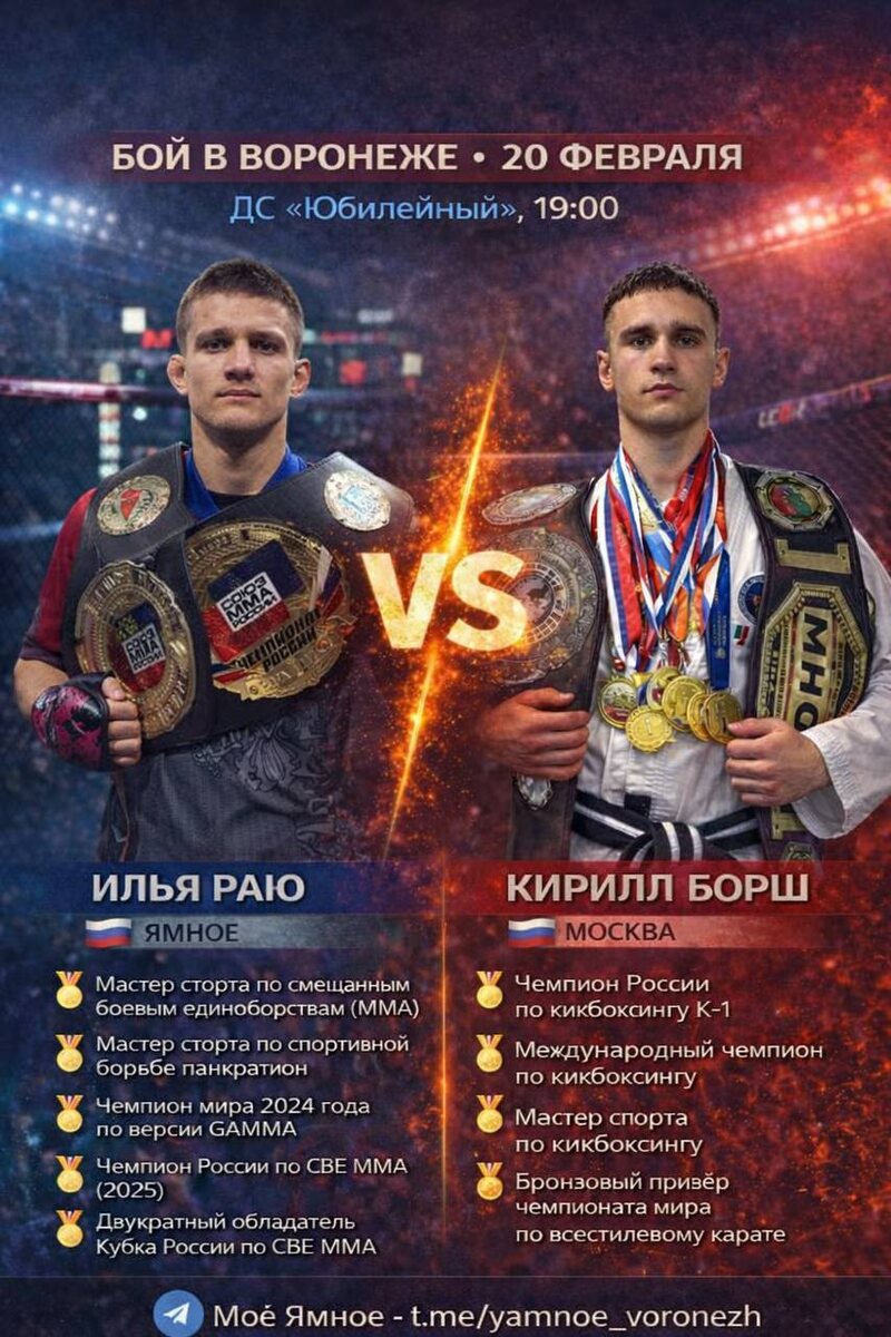 ! В главном поединке вечера встретятся два титулованных бойца: Илья Раю — чемпион мира по версии GAMMA 🆚 Кирилл Борш — международный чемпион по кикбоксингу K-1 Это будет не просто бой, а настоящее столкновение стилей, силы и характера. Зрителей ждёт драйвовая атмосфера, накал эмоций и жёсткая борьба до финального гонга. 🎟 Билеты уже в продаже: https://vrn.kassir.ru/sport/lds-yubileynyiy/fight-riot-x-open-fc1_2026-02-20 Не пропустите — главное спортивное событие зимы уже на подходе!