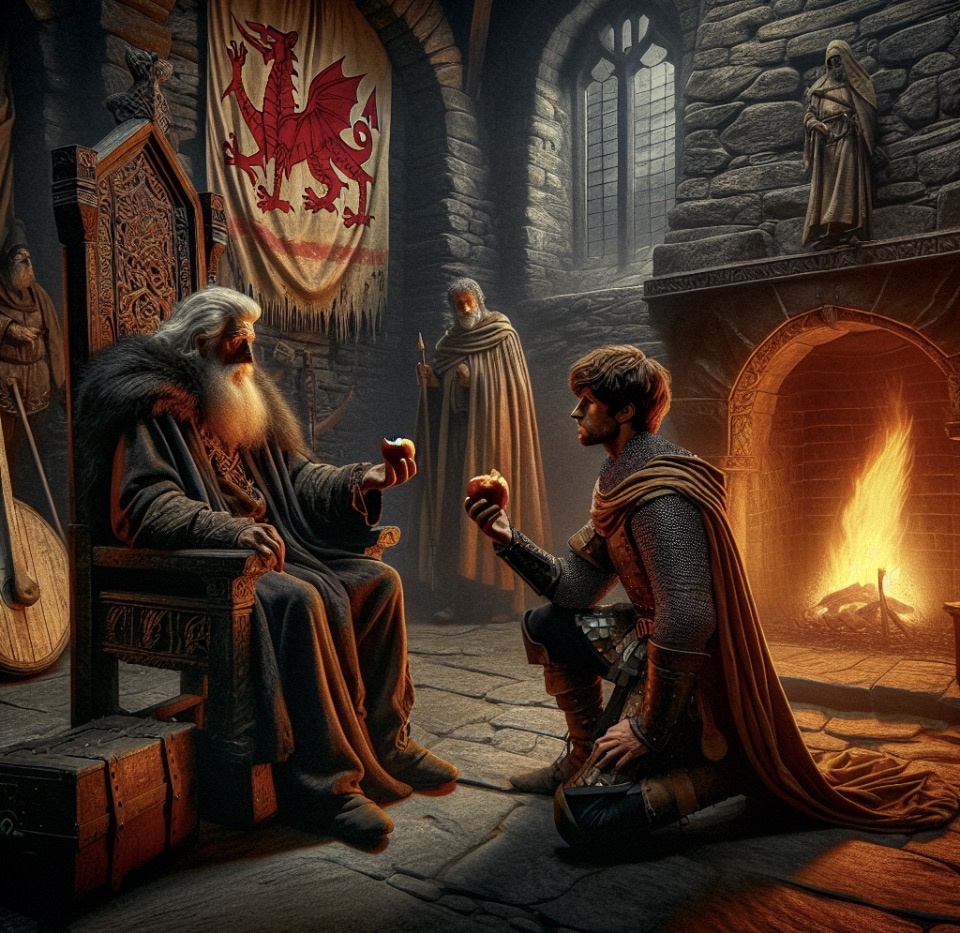 Их провели в зал, где у огромного камина сидел высохший старик с длинной седой бородой и глазами, полными иронии и усталости. Ллевелин Маредид жевал кусок яблока и слушал, как молодой бард перебирает струны арфы.