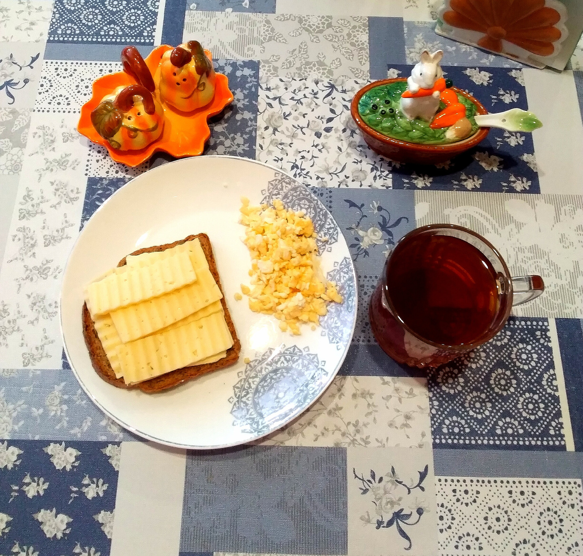 Скрэмбл, бутерброд и чай.