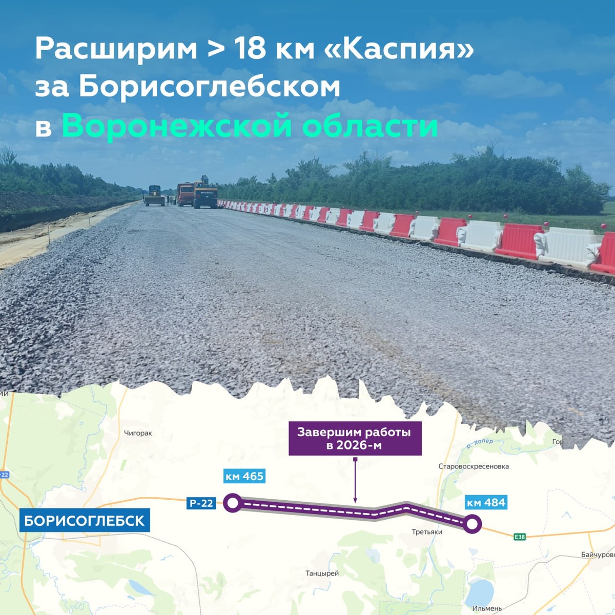 😎 С началом весны продолжим работы на 18-километровом участке в составе Р-22 «Каспий» (подъезд к г. Саратову) в Воронежской области, где расширим дорогу до четырёх полос. Объект готов на 29 %. Это ключевое направление региона. По маршруту едут в Саратов — важный культурный, экономический и образовательный центр Поволжья. После капремонта отрезок «Каспия» здорово преобразится: ▫️ возведём удобную проезжую часть шириной 14 м ▫️ установим шесть автобусных остановок для удобства жителей Танцыреи, Третьяков, Старовоскресеновки и Нововоскресеновки ▫️ уложим прочное дорожное покрытие и нанесём разметку ▫️ отремонтируем примыкания к регионалкам и местным дорогам На данный момент уже провели большую часть земляных работ — на 74 % подготовили нижний слой основания, на 50 % уложили верхний слой основания и нижний слой покрытия. Помимо прочего, привели в порядок примыкания и водопропускные трубы. Следующим этапом приступим к устройству верхнего слоя покрытия из ЩМА. Уже в ноябре этого года