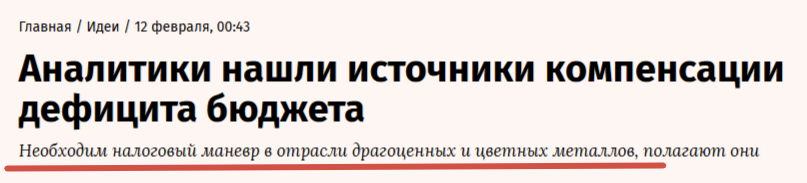 На общем фоне вялого российского рынка в последнее время заметно позитивно выделялись акции Полюса и Норникеля. Это два экспортера, для которых удачно сложилась конъюнктура: рыночные цены на золото и цветные металлы в последние месяцы показывали существенный рост. Но 12 февраля вышла новость, в которой аналитики SberCIB указали на возможность получения дополнительных налогов с цветной металлургии, коль уж сложилась такая благоприятная конъюнктура. В частности, они считают, что повышение НДПИ для золотодобытчиков могло бы компенсировать целый 1 трлн рублей в дефиците федерального бюджета на текущий год, а для Норникеля - еще 200 млрд рублей. Ставку налога, по их расчетам, могут поднять в три раза, такой ход аналитики называют "налоговым маневром". Примечательно, что подобная информация поступила от каких-то аналитиков аналитической компании, а не от, например, Минфина, тем не менее, акции обоих компаний мгновенно отреагировали падением. Акции Полюса упали на 3-4%. Акции Норникеля - тож