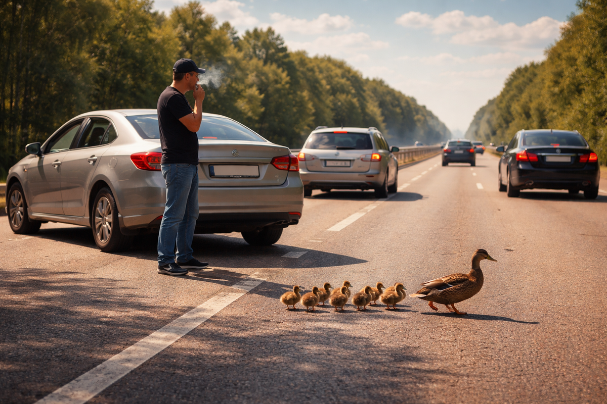 Однажды, двигаясь по трассе на приличной скорости, я случайно заметил утку, а за ней — целую стайку утят, которые беспечно перебегали дорогу. Решив не терять момент, я остановился, без всяких колебаний поставив машину поперёк встречной полосы, а сам вышел на воздух, чтобы немного покурить. Участок дороги был ровный и прямо-таки напрашивался на быструю езду, но вот водители, замедляя движение, не раздражались, а наоборот, улыбались, ожидая, когда малыши доберутся до безопасной стороны. Этот короткий эпизод, казалось бы, не стоящий внимания, всё-таки оставил тёплый след в душе. Приятно, когда на дороге встречается взаимопонимание и культура общения, что случается, увы, не так часто, как хотелось бы.