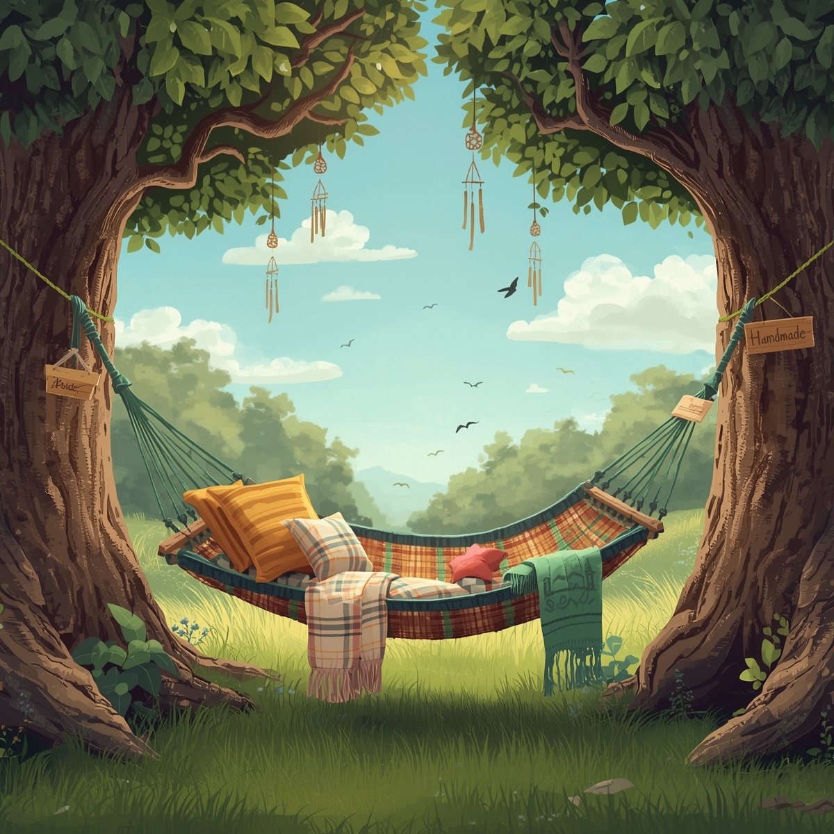 1. Опоры: Лучше всего два дерева (диаметр ствола не менее 20 см). Либо специальные стойки для гамака (продаются в магазинах).